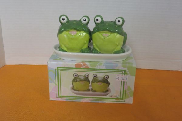 This adorable set of ceramic salt and pepper shakers comes with a tray. The frog theme fits perfectly for nature attractions and other themes you may have in your home. Comes in a colorful box. Made in China