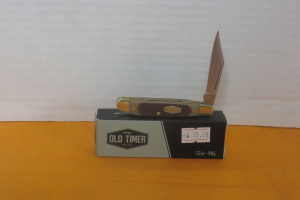 Old Timer Pal Pocket Knife, single blade. Measures 2 7/8 inches closed. Stainless clip blade, saw cut derlin handles with nickel silver bolsters and inlay shield. Make a nice gift.