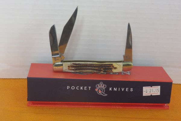 Stockman 3 bladed pocket knife, 4 inches closed. Mirror finished D2 tool steel. Clip, Sheep Foot and Pen Blades. Bone Handle, Queen Steel in storage box. Make a nice gift.